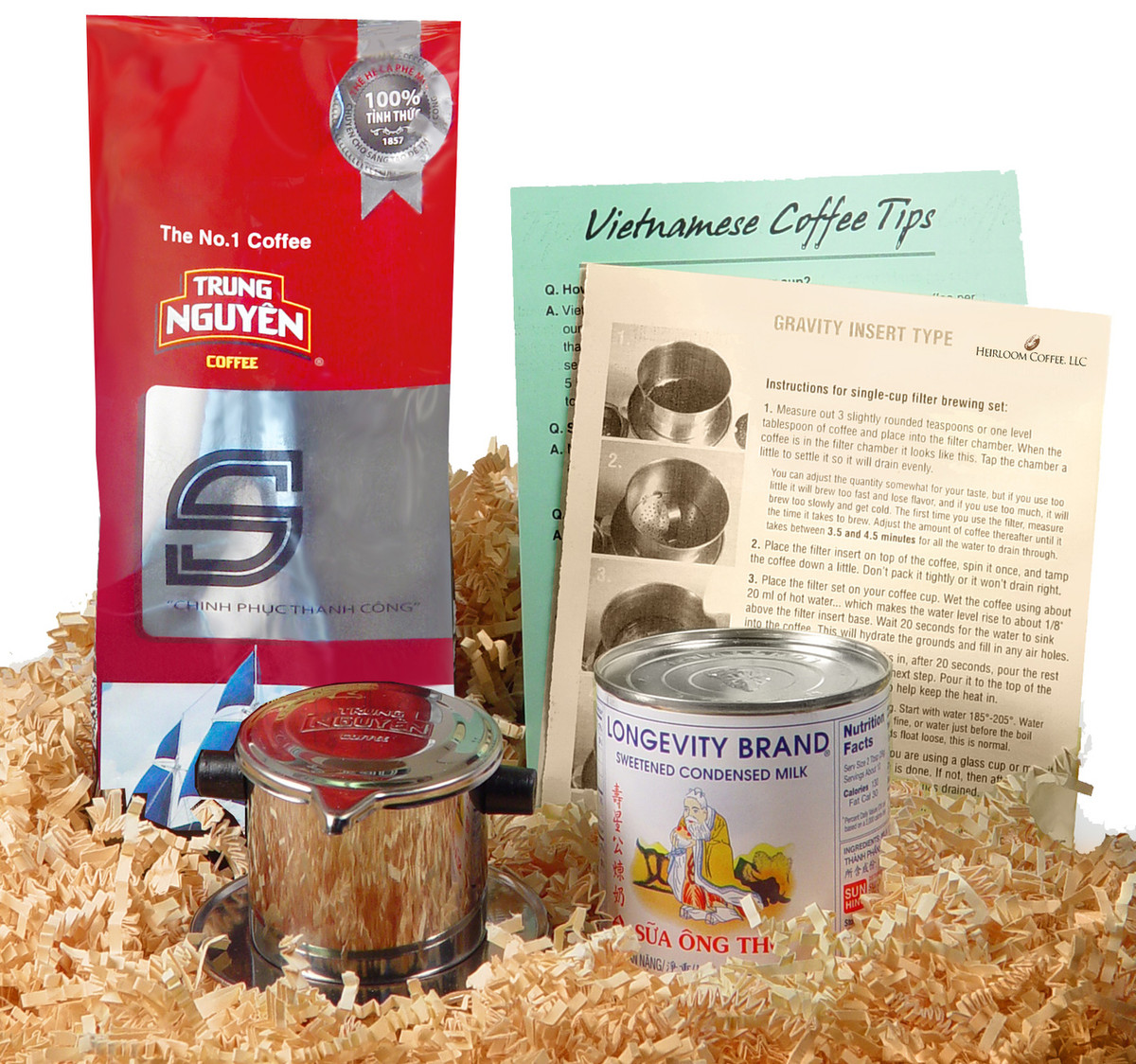The S Coffee has become our customer favorite, outselling Gourmet Blend now 3:1, so it's time we gave it its due and created a Vietnamese Coffee Kit featuring it. Kit contains everything you need for perfect hot or iced Vietnamese Coffee at home. Great gift!