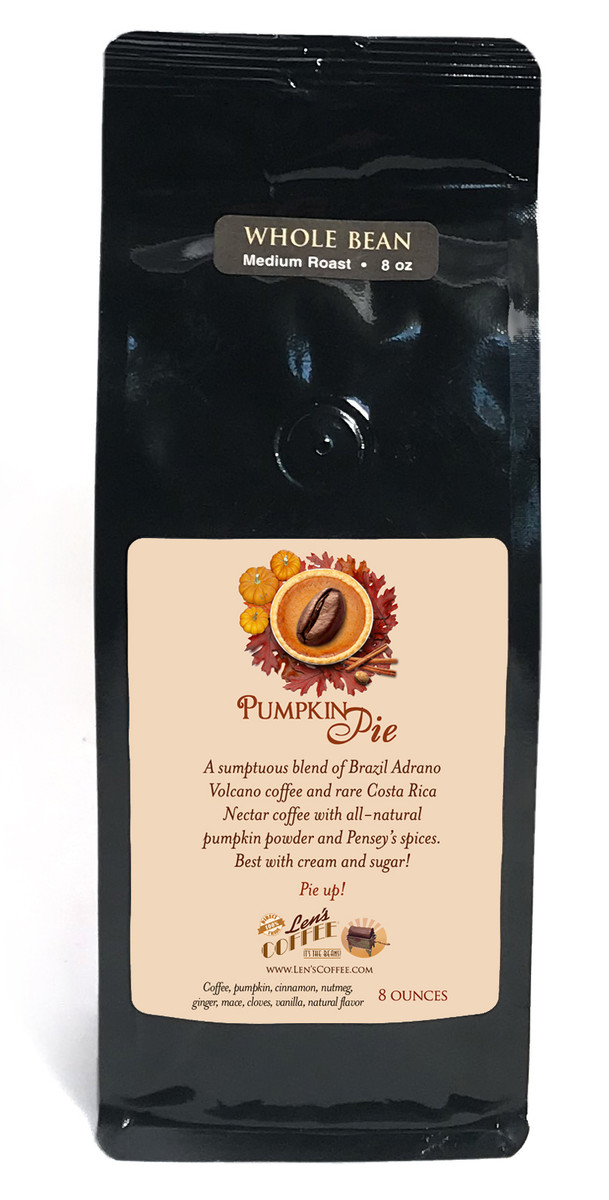Our luscious Pumpkin Pie coffee is an all-natural seasonal blend with real pumpkin and fresh gourmet spices, from Penzey's and featuring our very own ginger from Vietnam.